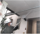 【洗浄】 近隣の皆さまへの配慮を徹底するため、必要に応じて洗浄中に防護ネットを使用し、洗浄カスの飛散を防止します。 また、塗り替え工事中の塗料の飛散も防止するよう努めています。 ![]() |