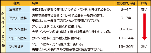 外壁・屋根の塗り替えを行う際に、チラシやHPなどの価格だけを注目される方がいらっしゃいますが、これは非常に危険です。まずは塗料には樹脂という成分が入っており、樹脂によって塗料の価格が変わるということを知っておいて欲しいと思います。次の表は一般的に使用される塗料の樹脂の違いによる性能の違いを表にしたものです。