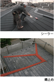 一概にスレート屋根と言っても、納めの棟部分は鉄板で瓦はスレート材になっています。異なる素材にはそれぞれ適した材料を塗ります。鉄部の部分には下塗りとして錆止めを塗り、スレート瓦にはシーラーを塗ります。シーラーは素材と上塗り材の密着機能を果たします。