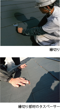 また、下塗り後、縁切り部材のタスペーサーを重なりの部分に、スレート瓦一枚当たり2箇所、適正な場所に差し込むことで上塗り完了後も適切に隙間が確保され縁切りを行ったと同様の効果が得られます。